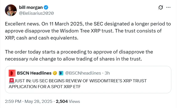 For context, the US SEC has officially initiated its review process of WisdomTree’s XRP ETF application, bolstering market confidence.