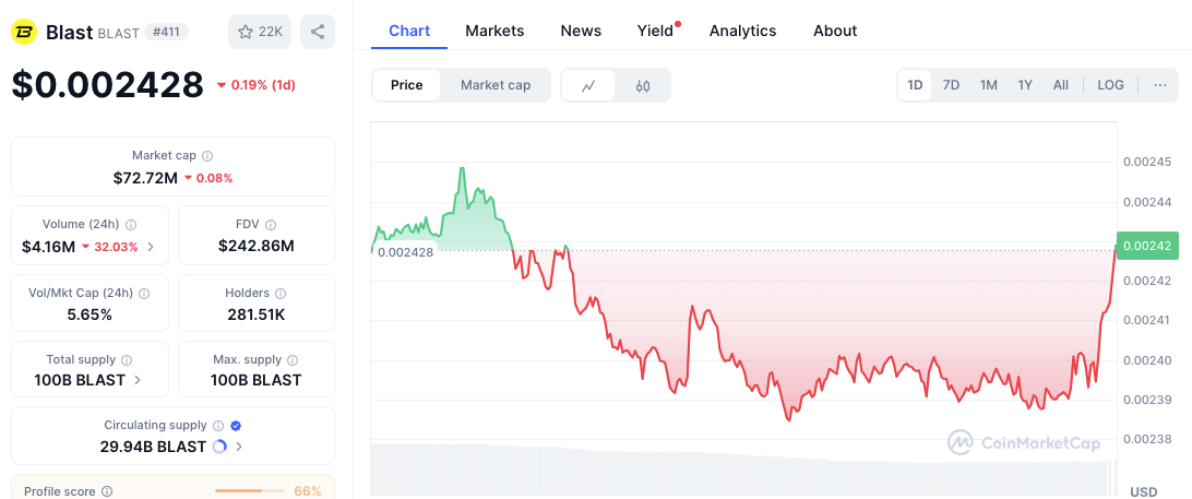 BLAST tops the list, accounting for $25.15 million or 35.08% of its circulating supply. Despite this, its price has seen modest changes, currently at $0.002411.