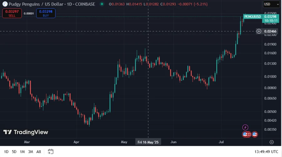 The +30% increase in token transfer milestone is a testimony to PENGU’s resilience and acceptability in the volatile crypto market. This can also be seen in its recent uptrend price movements. The asset, which is currently trading at $0.03313, has been up 125.1%, 125.0%, and 227.3% over the past seven days, two weeks, and one month, respectively.