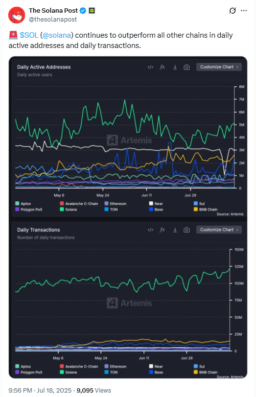 Network activity also remains strong. Figures from Artemis show Solana crypto ahead in daily transactions and active addresses.