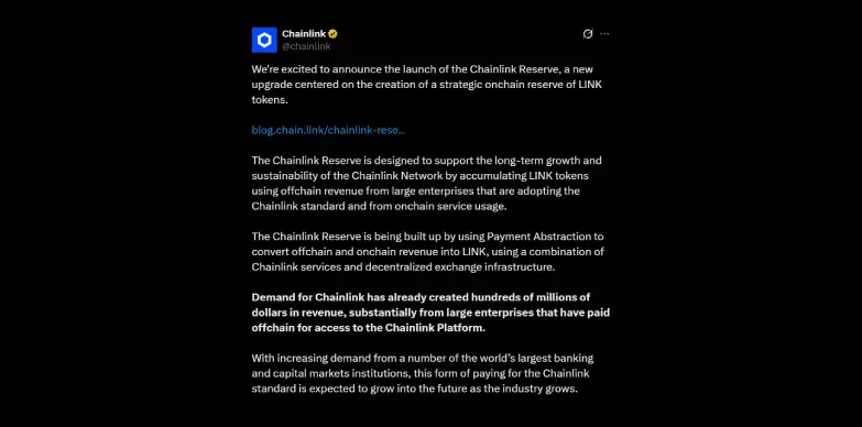 Chainlink has officially launched its Chainlink Reserve today, August 7, 2025. This Reserve is a strategic reserve pool that will accumulate LINK on the basis of revenue streams from both on-chain and enterprise-level off-chain services.