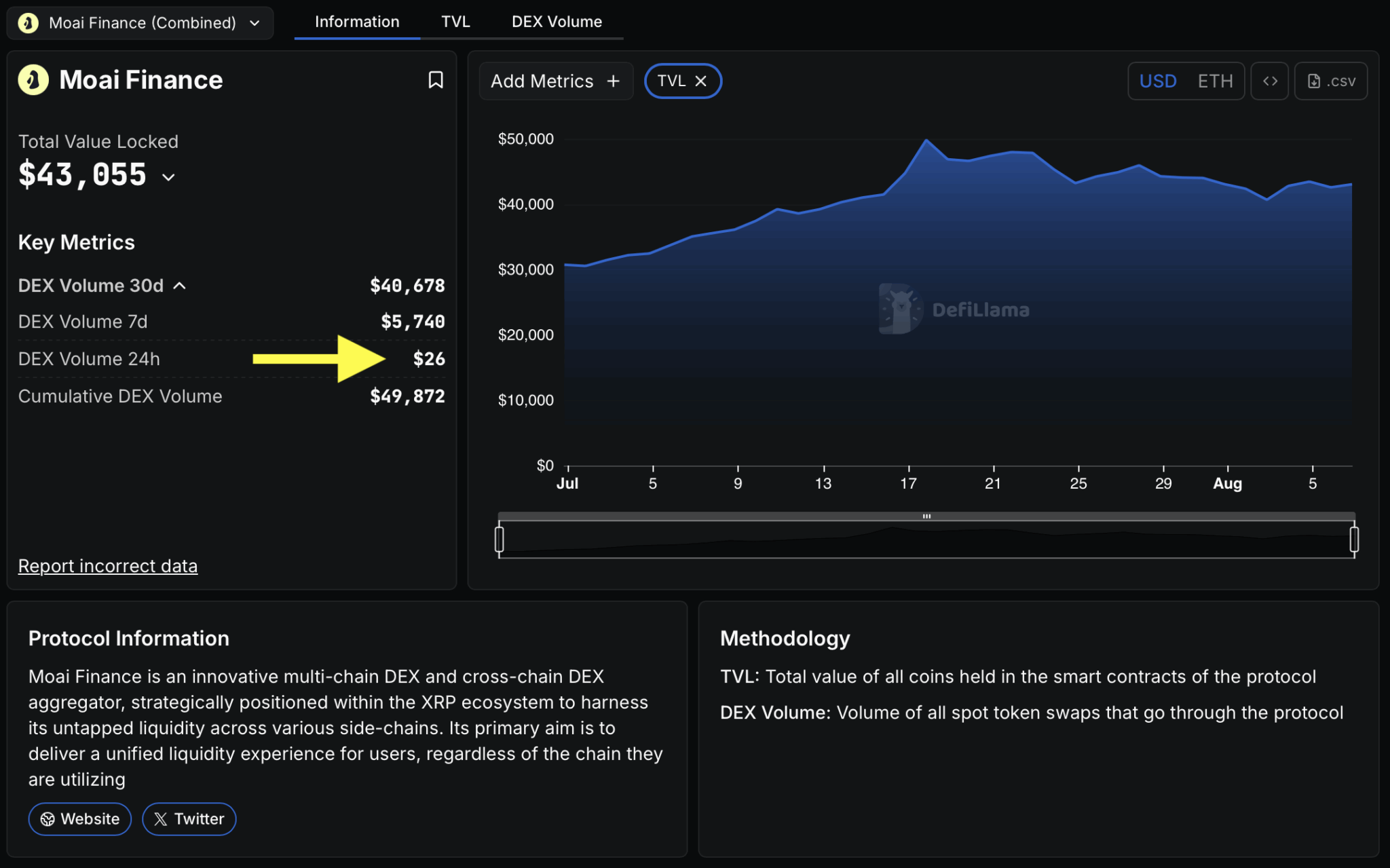 As of yesterday, this ostensibly “innovative multi-chain DEX and cross-chain DEX aggregator, strategically positioned within the XRP ecosystem” called Moai Finance had processed just $26 worth of trades over the prior 24 hours.