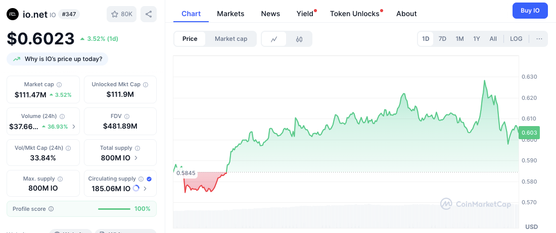 Meanwhile, IO unlocked $6.08 million, and the token surged almost 4% to $0.6067, riding a strong intraday rally after bottoming at $0.572. A sustained move above $0.630 could trigger a push toward $0.65. Failure to hold $0.600 may lead to a pullback to earlier lows.