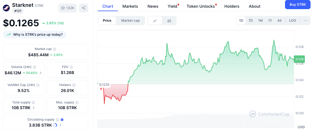 STRK rose nearly 3% to $0.1266, reclaiming short-term support near $0.1255. If it breaks $0.1290, the price may aim for $0.132 and beyond.