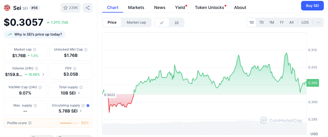 Similarly, Sei, which released $17.07 million in tokens, remained stable around $0.3056, showing mild gains.