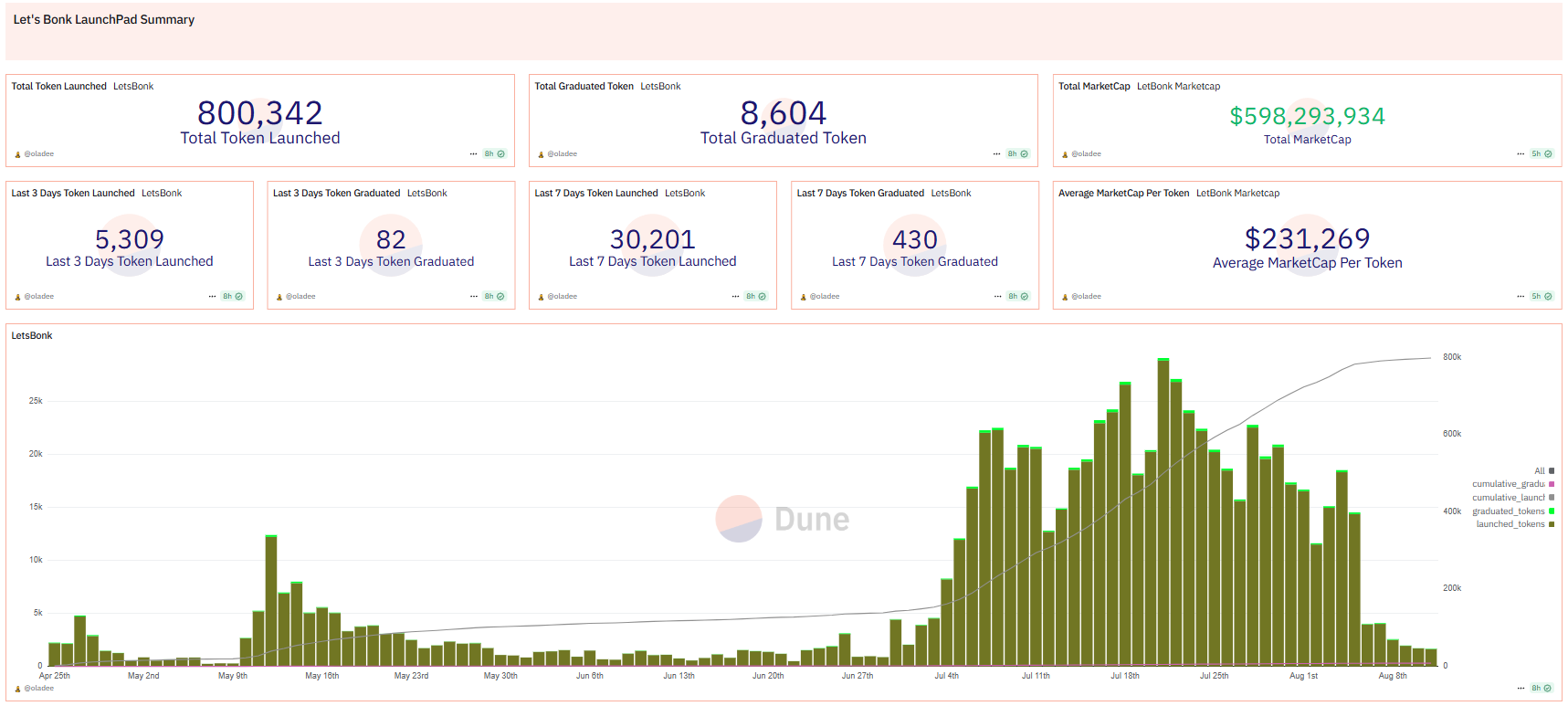 • Over 800,000 tokens launched on Let’s BONK, but very few make it to graduation.