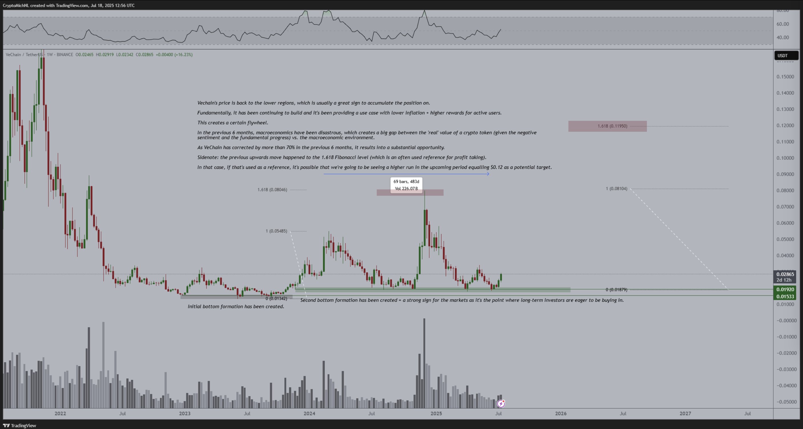 Other prominent analysts, like Michaël van de Poppe, estimated equally impressive potential, with a long-term target price of $0.12. He pointed to a bullish sign of a double-bottom structure built since mid-2023 and early 2025. The historical accumulation level of $0.019-$0.028 has supported prices previously, and a recent position in this area supports accumulation.