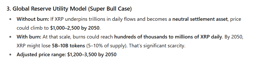 In the third scenario, ChatGPT noted that XRP could serve as a neutral global reserve settlement asset for trillions in daily flows. Under this outlook, it predicts XRP to rise $1,000 to $2,500 without factoring in the burn.