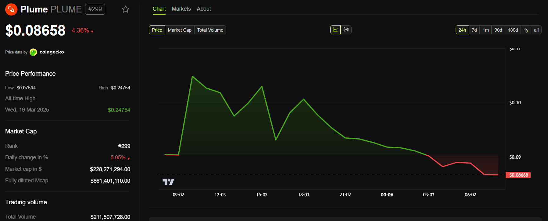 After its Binance listing, PLUME soared over 30%, surpassing $0.11. The rally came from community hype and inflows from retail traders. Its 24-hour trading volume exceeded $200 million, a 10x increase compared to previous days.