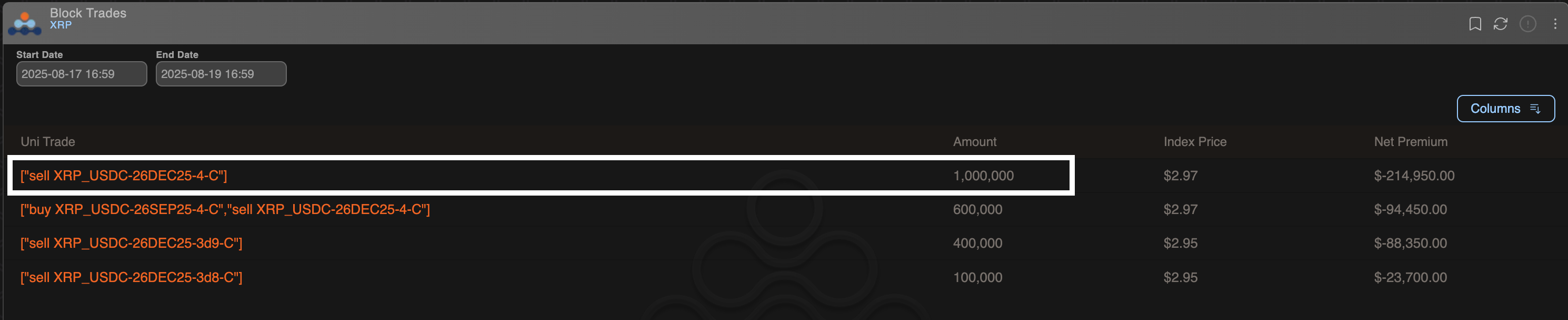 Data tracked by Amberdata shows that one million contracts of the $4 call option expiring on Dec. 26 changed hands via a block trade on Monday. Contracts on Deribit are sized 1,000 $XRP. A block trade is a large transaction that is privately negotiated and executed over the counter and then listed on the exchange.