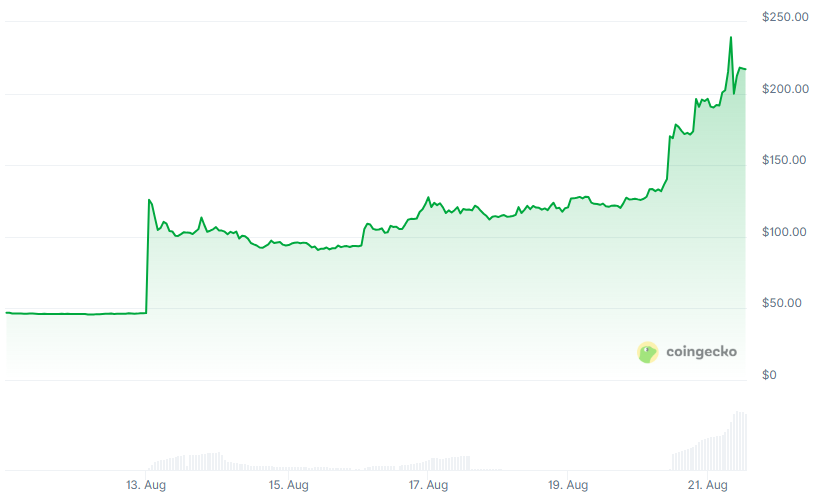 OKB jumped as much as 70% early Thursday to reach $239, representing a 391% gain over the past two weeks, according to CoinGecko. The token has since retraced to $217, still up 28% on the day and more than 121% over the past week.