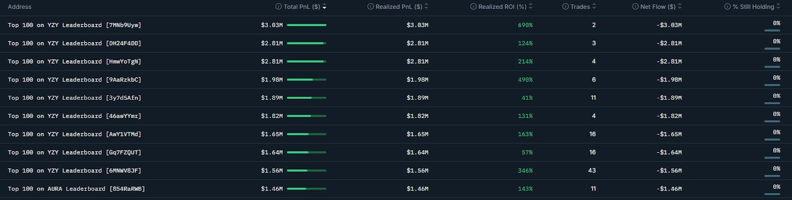 YZY Token Profit and Loss Leaderboard | Source: Nansen