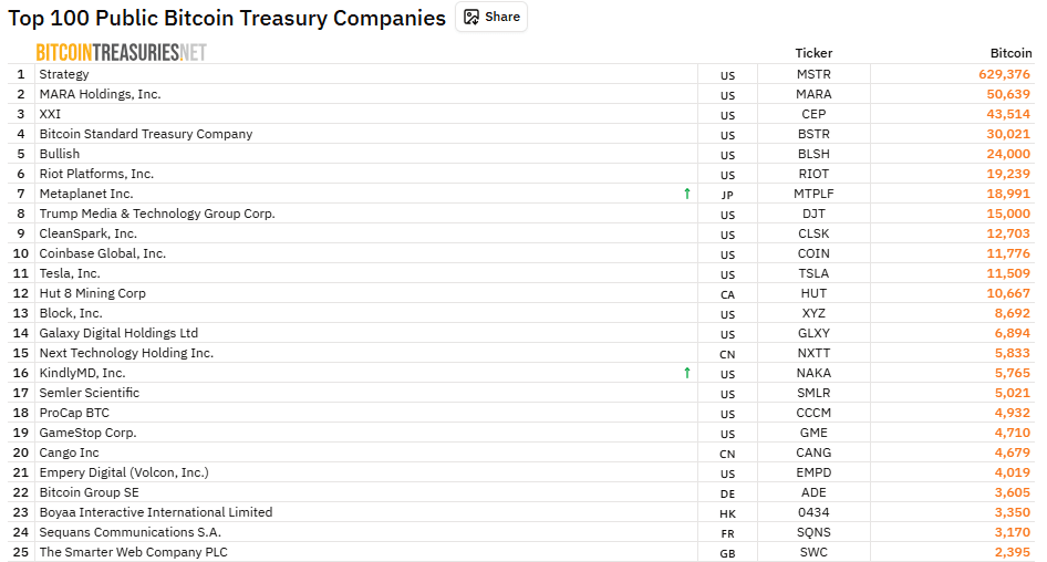 Top public Bitcoin treasury companies (Source: BitcoinTreasuries.NET)