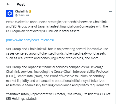 - SBI Group has partnered with Chainlink to create institutional-grade tokenization tools across Asia.