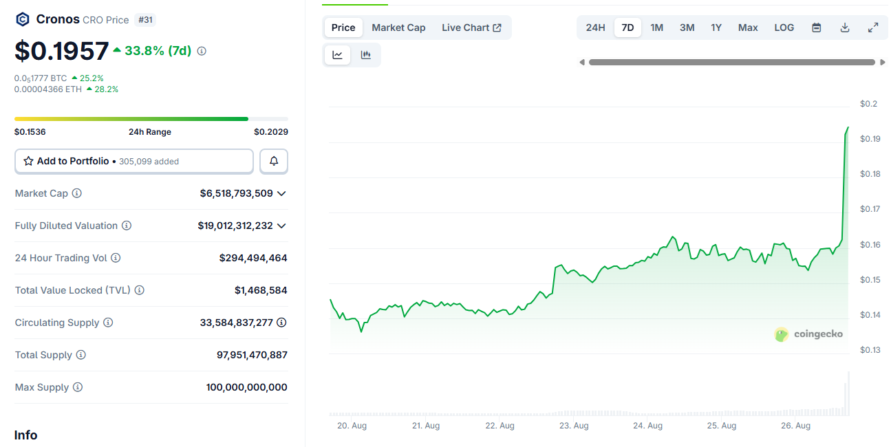 Soon after the announcement, CRO reacted with a vertical rally, rising to a 12-month peak. CRO recovered to over $0.20, a level not seen since December 2024.