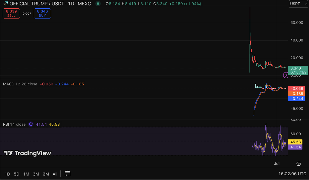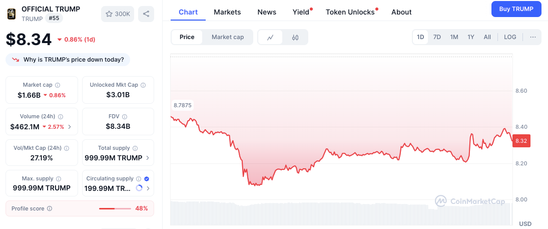 At press time, $TRUMP was trading near $8.32, marking a 1.19% daily decline. The coin faced resistance around $8.40 to $8.45, where repeated rejections occurred during intraday trading. A stronger barrier sits near $8.78, the opening level.