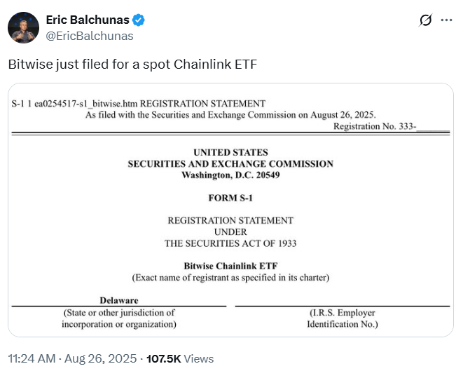 Bitwise submitted the application to the SEC under the Securities Act of 1933. The proposed product was listed as the “Bitwise Chainlink ETF.”