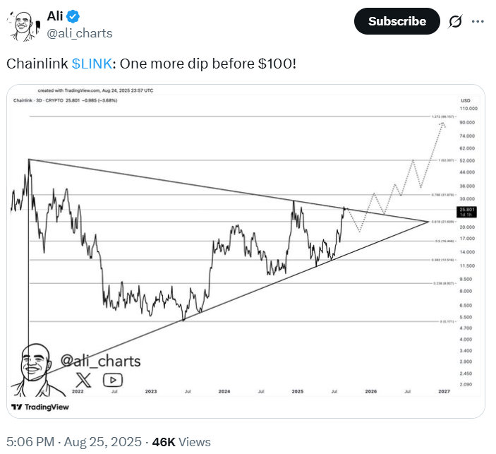 Market analyst Ali Martinez suggested that LINK could see one more dip before a price increase, a projection in line with previous forecasts.