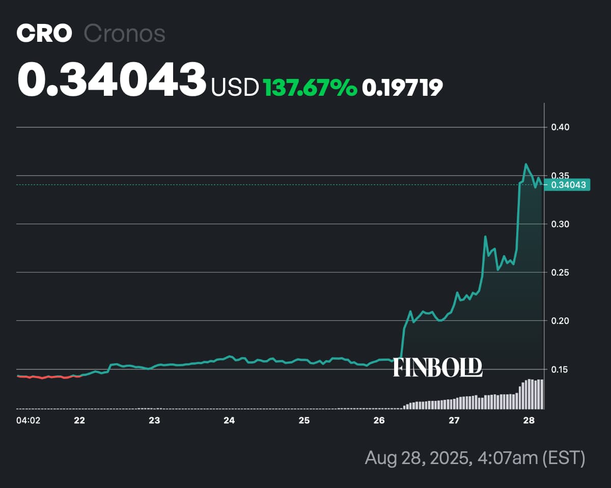 Cronos (CRO) has staged one of its sharpest rallies on record, surging more than 53% in the past 24 hours and nearly 137% over the past week. The move was fueled by a wave of news connecting the token to both Donald Trump’s media empire and a proposed U.S. crypto ETF.