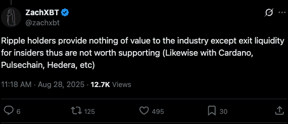 Crypto investigator ZachXBT sharply criticized Ripple, calling its community “exit liquidity” for founders.