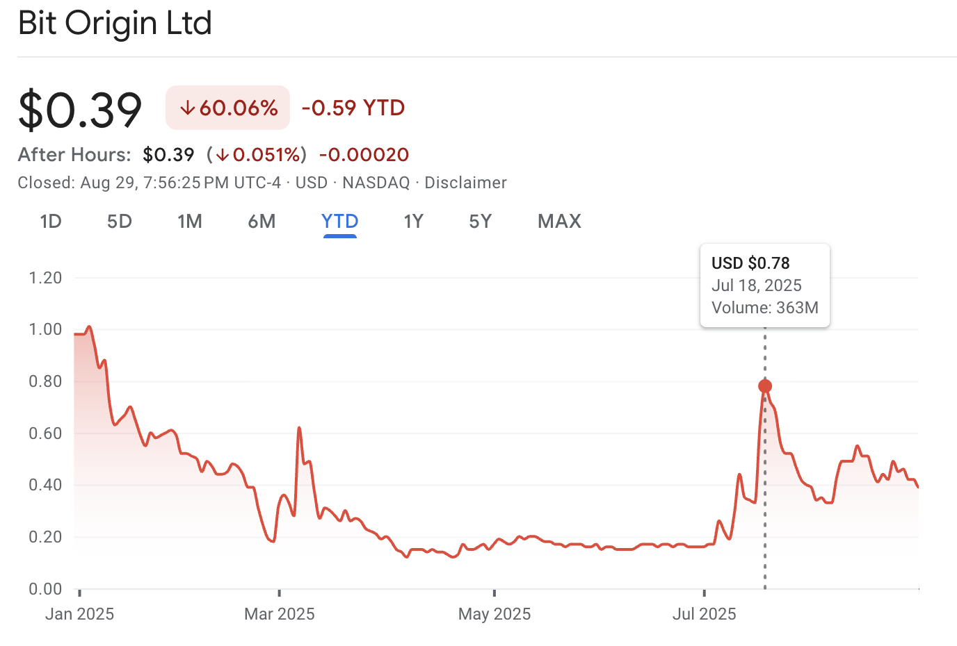 However, the share performance of these companies has so far remained weak. Bit Origin’s stock (BTOG) climbed to a peak of $1 on July 18 but had fallen to $0.39 by the close on August 29.