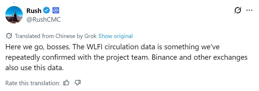 CoinMarketCap CEO Rush Lu said the circulating supply figure on their data site was “repeatedly confirmed” with the WLFI team. Lu added that the figure will be adopted by major exchanges listing the token.