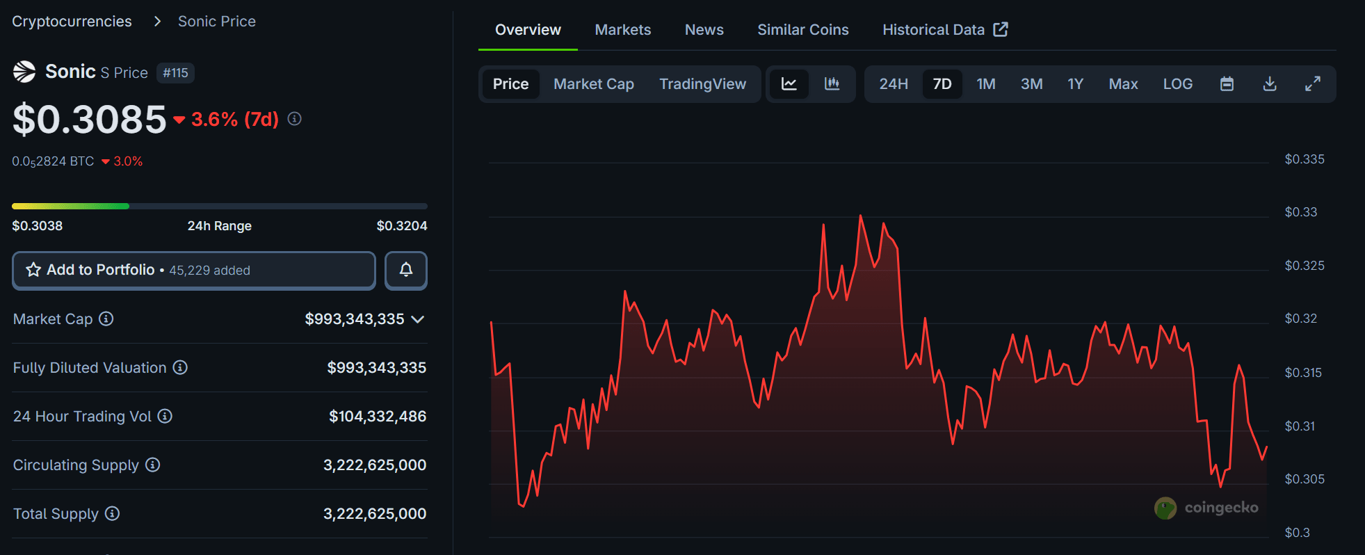 According to CoinGecko, Sonic Labs has a market capitalization of $993 million, with the token currently trading around $0.3085, down 3.6% over the past seven days.
