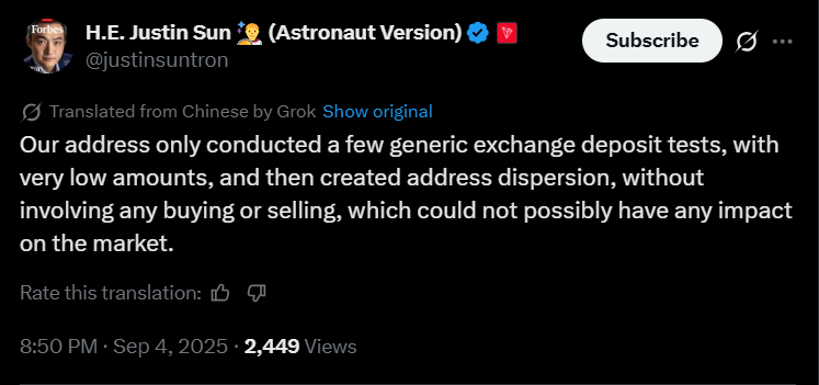 Sun denied the allegations that he has been dumping WLFI through his own exchange. Instead, he stated the token moves were experimental and had to test the exchange infrastructure.