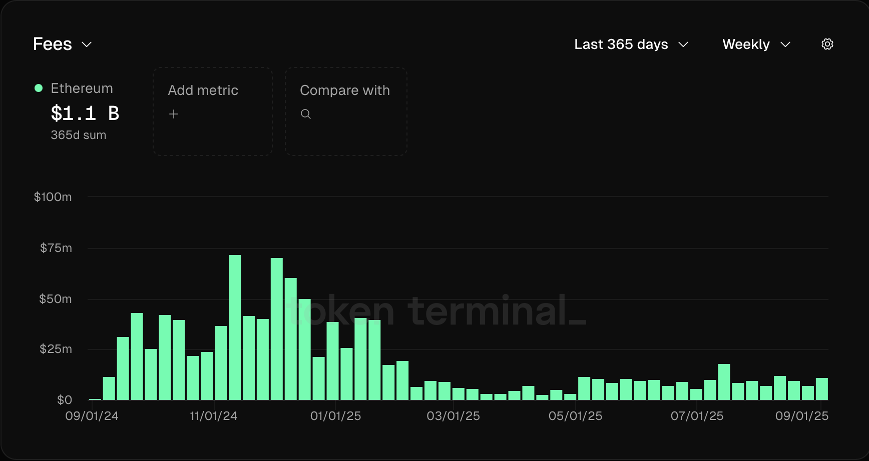 According to Token Terminal, Ethereum has collected $1.1 billion in fees in the past calendar year. However, the amount of fees collected has plummeted since February.