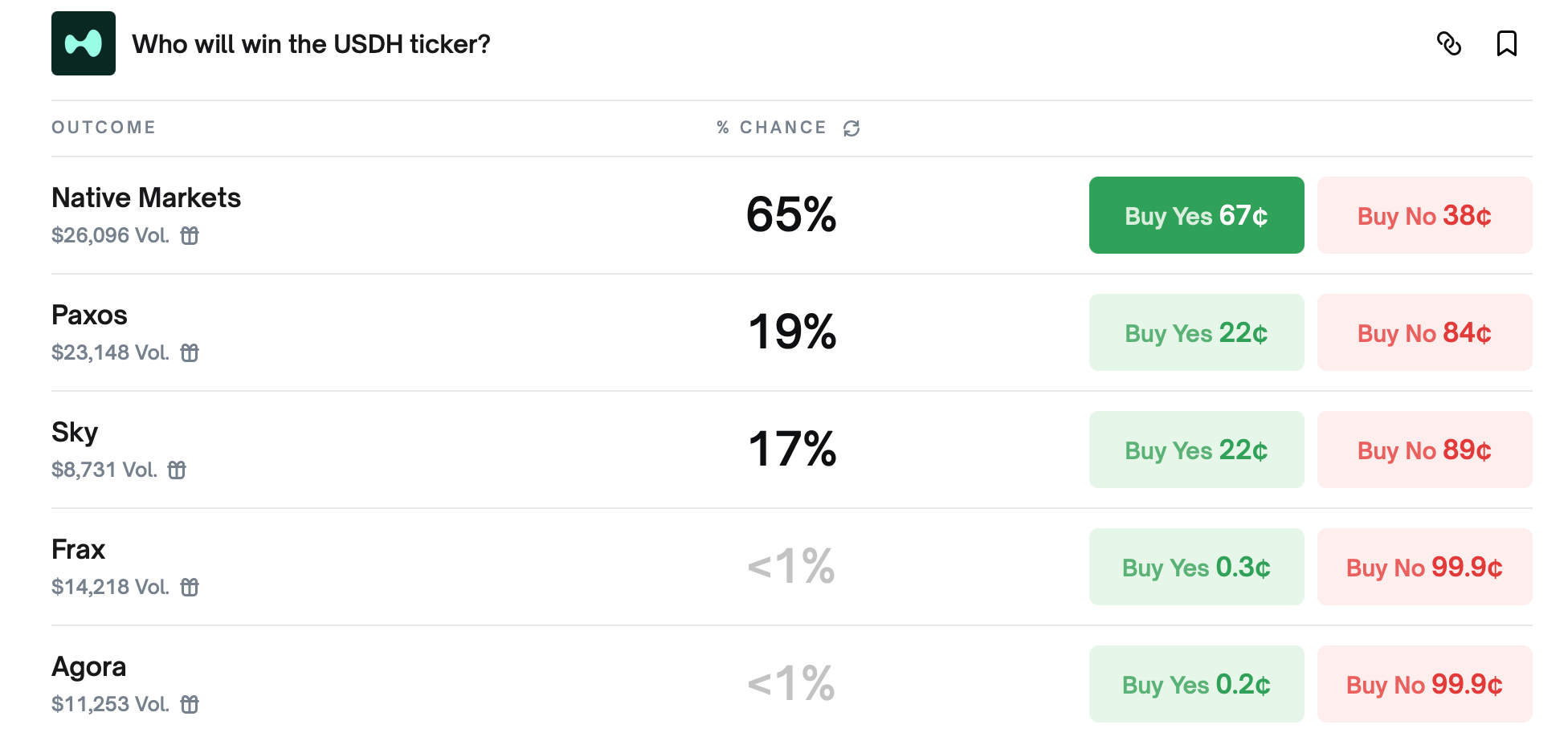 Polymarket odds reflect community sentiment with Native Markets at 65%, Sky at 17% and Paxos at 19%, while Frax and Agora hover below 1%. Bastion does not appear in Polymarket’s listed outcomes.