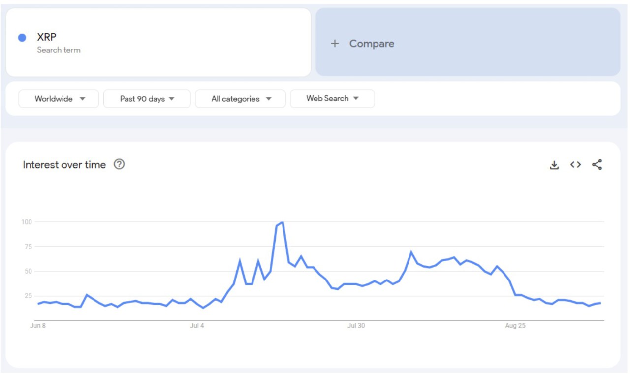 Total value locked on XRPL has also slipped from $120M to $98M, while DEX activity hit its lowest level since April. And Google Trends data shows interest in “Ripple (XRP)” has collapsed from a score of 100 to just 19 in two months.