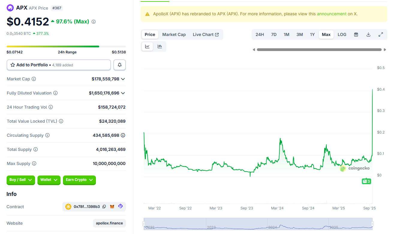 APX became one of the top gainers for the past day, expanding by 400%. The token rallied after the announcement of a potential swap into Aster tokens, supporting the growing perpetual DEX platform.