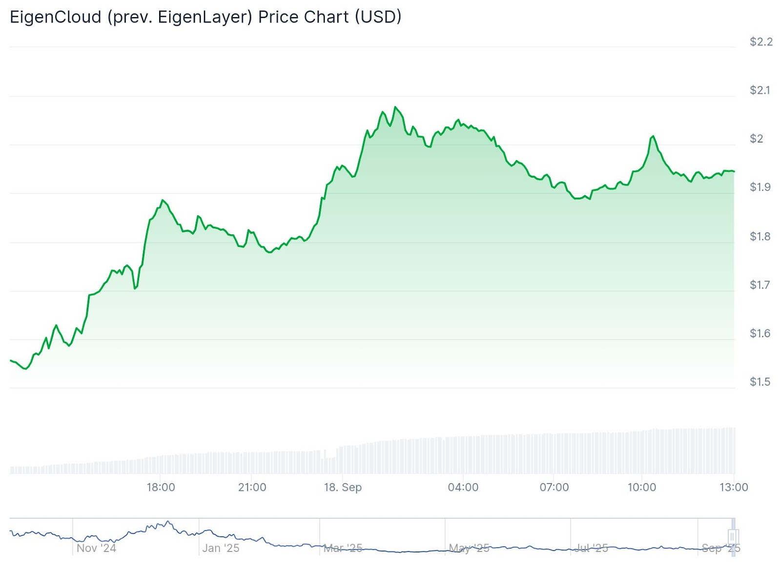 EIGEN is currently changing hands at $1.94, up 25% on the day and over 35% over the past week, per CoinGecko.