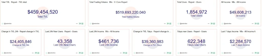 At the time of writing, data from Dune shows Aster holding $459.45 million in total value locked (TVL), alongside $519.63 billion in cumulative trading volume and 1.85 million registered traders.
