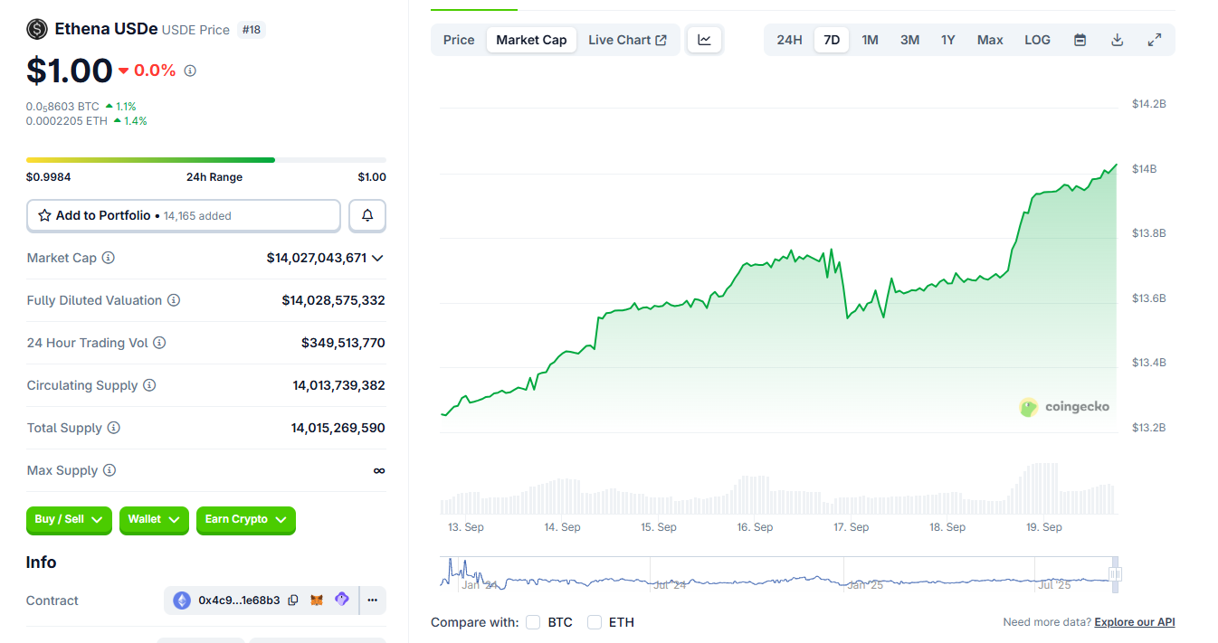 Following the recent period of growth, Ethena expanded USDe to over 14B tokens. Of those tokens, a record amount of 6.09B are staked, offering a 20% premium.