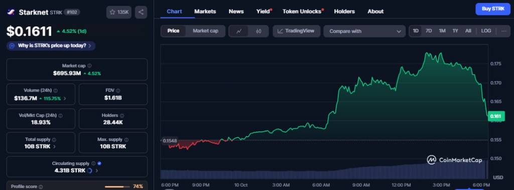 Starknet has gained more than 10% and around 25% the previous week and month.
