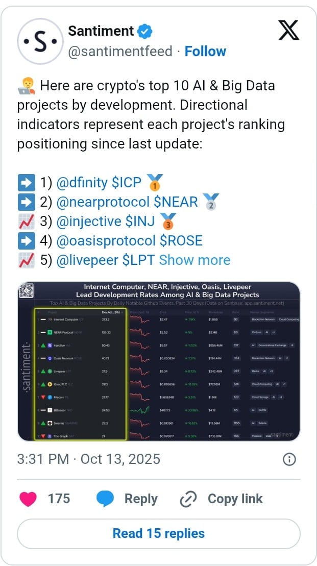 - Internet Computer (ICP) and NEAR Protocol lead the top 10 AI and Big Data cryptos with the highest development activities.