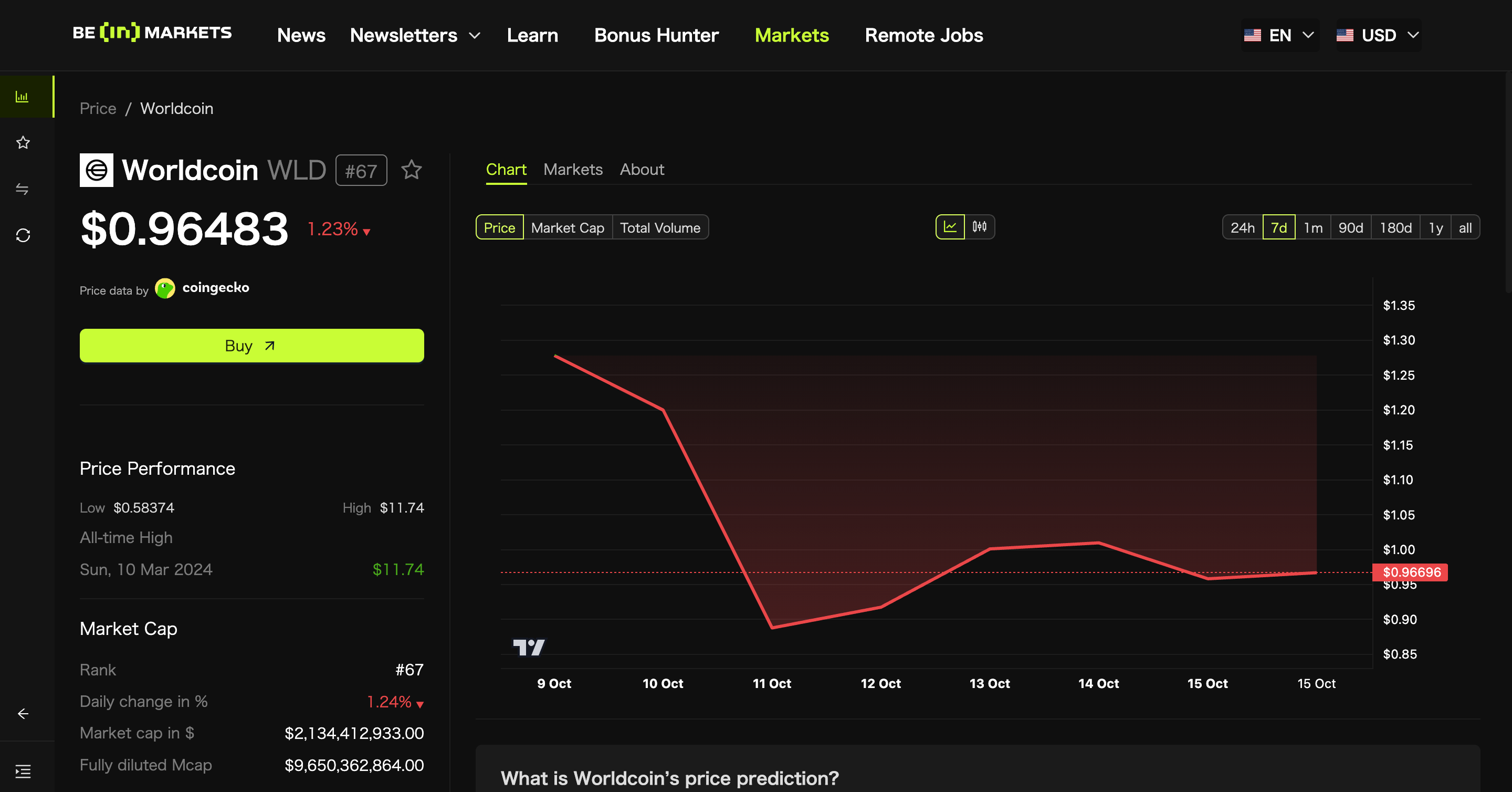 The pilot unfolded against a backdrop of volatility in the Web3 ecosystem. Worldcoin (WLD), the token associated with Tools for Humanity, traded at $0.96 as of publishing, down from $1.35 earlier in the week after touching a low of $0.89 on October 11. The price movements reflected broader market trends and investor sentiment rather than any direct connection to the advertising trial.