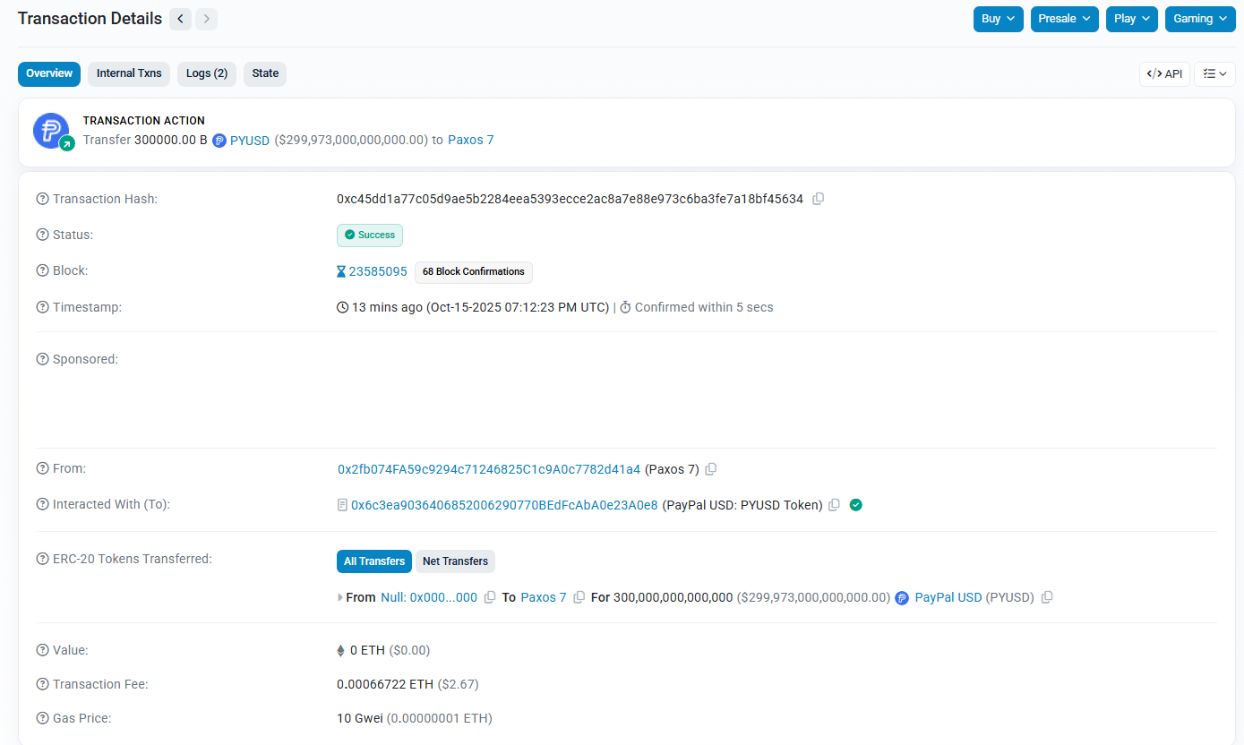 The entire $300 trillion worth of printed PYUSD was burned in a second transaction.