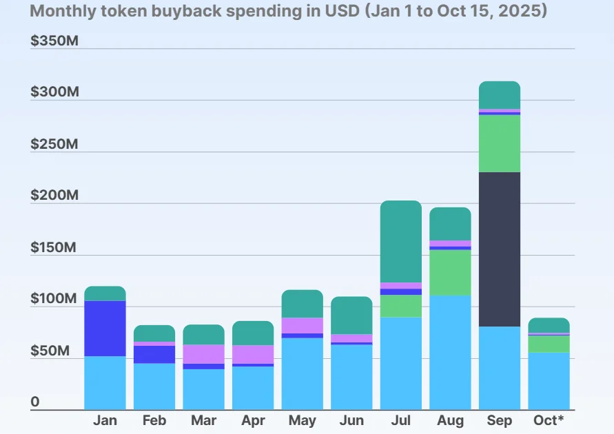 The cadence picked up sharply in the second half of the year after an 85% month-on-month rise in July. September’s spike owes a lot to LayerZero’s one-off move; excluding ZRO, September still registered about $168.45 million in buybacks. The first half of October had already seen $88.81 million booked, keeping monthly totals above the first-half average.