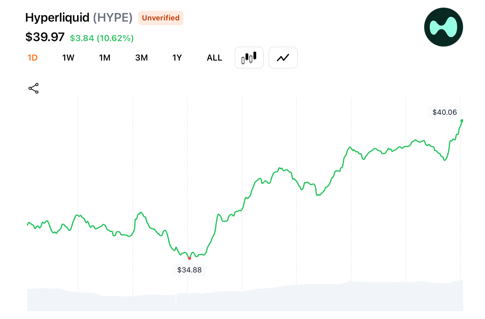 The S-1 filing announcement sparked a rally in HYPE’s price, rising between 8% and 15% within 24 hours to around $37.73–$40.11, while trading volume climbed 9% to approximately $12 billion. At press time, at 9 a.m. on Thursday, HYPE stands at $39.97 per coin.