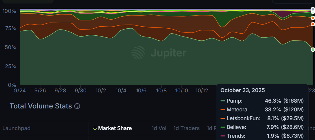 Pump.fun remains the largest launchpad for memecoins on Solana, accounting for roughly 44% of market share, according to Jupiter data. However, that figure is down from a peak of around 75%.