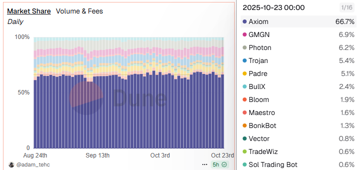 Padre is a memecoin trading terminal live on Solana, Base, Ethereum, and BNB Smart Chain, and looks to compete in the trading bot space, which is currently dominated by Axiom. Padre has a market share of around 5%, according to Dune Analytics.