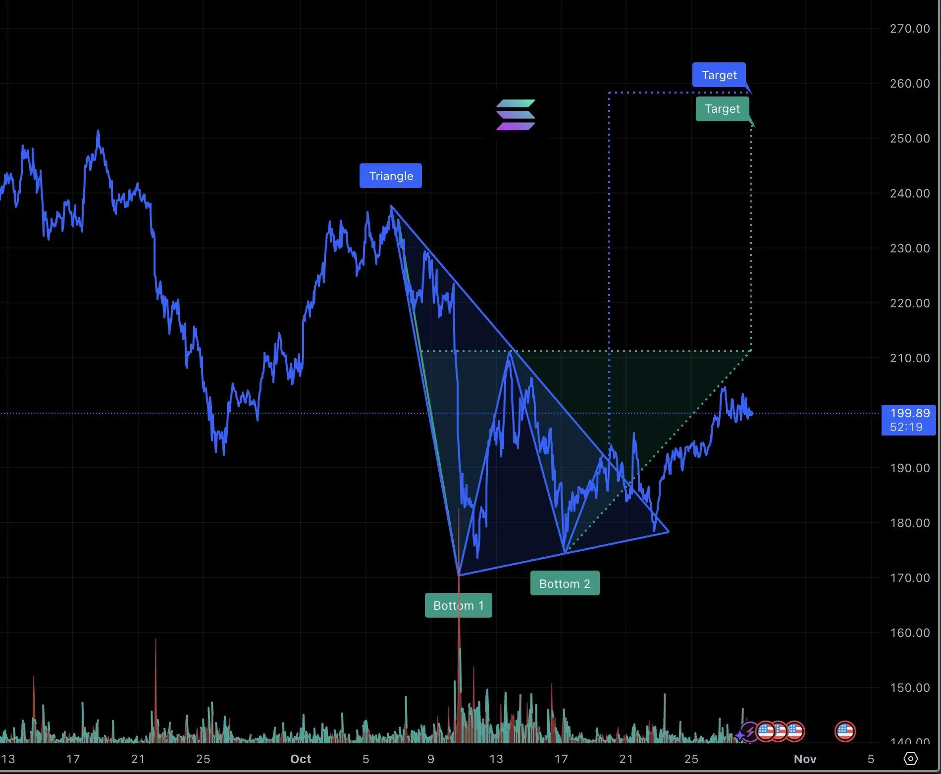 Meanwhile, Solana (SOL) trades near $197.51 after a brief pullback of 1.69% in 24 hours. Analyst MartyParty noted that Solana’s one-hour chart shows bullish momentum after confirming a double-bottom reversal between $167 and $175. The breakout above $190 signals potential continuation toward resistance at $210, with projected targets of $252 and $258.