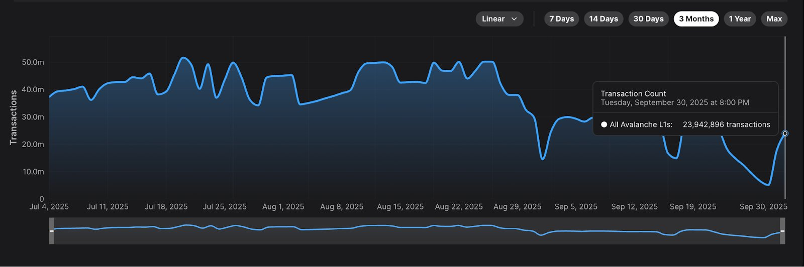 Avalanche’s onchain data points to significant user activity, averaging over one million daily transactions, with a peak of 51.6 million daily transactions during the past quarter, according to Nansen.