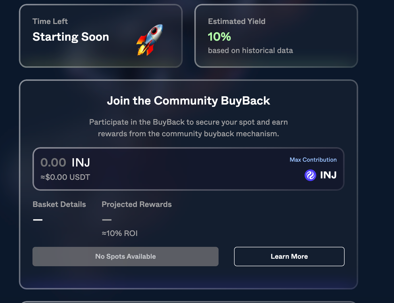 The buyback, which opened on Wednesday, allows community members to commit INJ to a pool that will be used to purchase and burn tokens, reducing overall supply. In return, participants receive a 10% yield from Injective’s ecosystem revenue.