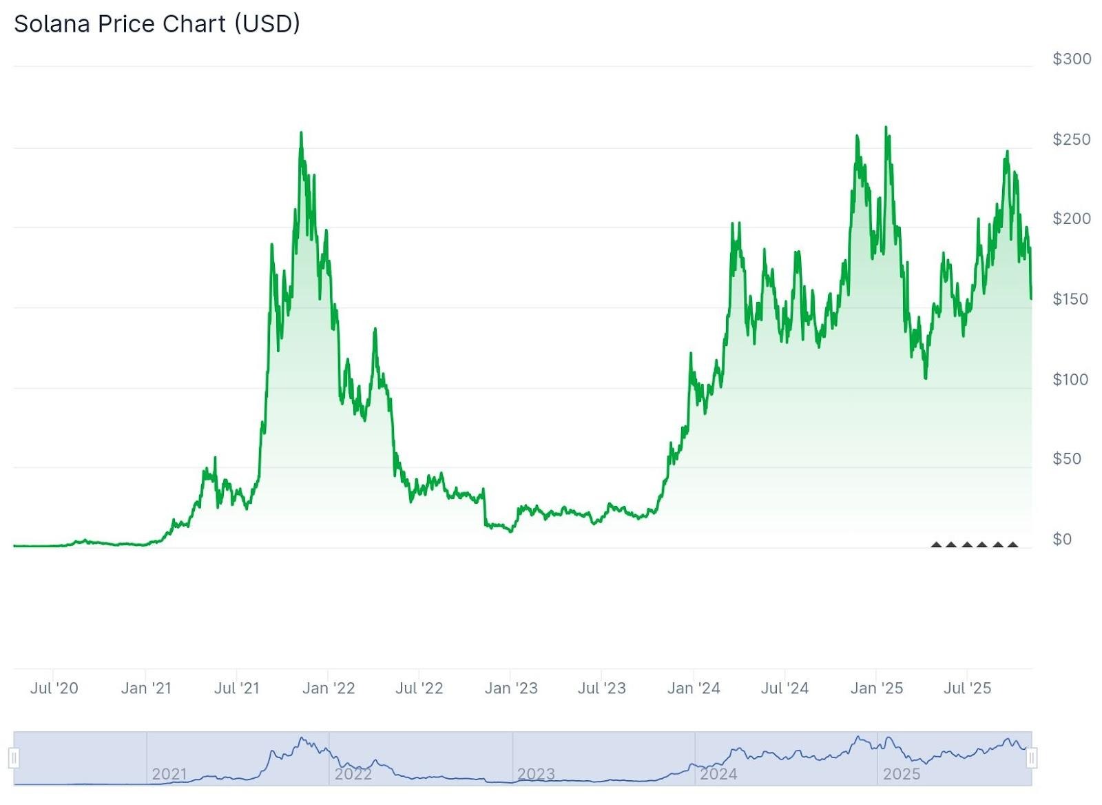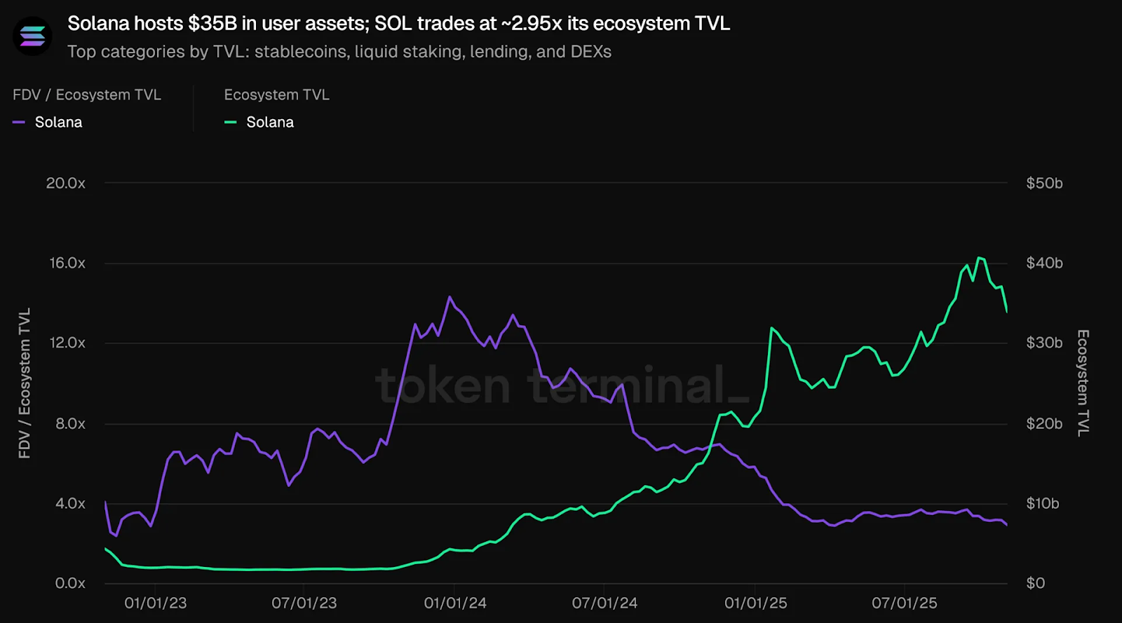 Over the same period, Solana’s fully diluted valuation (FDV) increased from $40 billion to $100 billion, meaning SOL now trades at roughly 2.95 times the ecosystem’s TVL, down from 14 times a year ago.