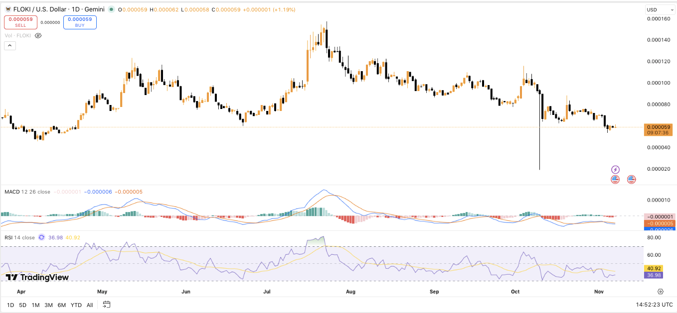 At press time, FLOKI trades at $0.00005894, up 1.37% in 24 hours, with a market capitalization of $568 million. However, it remains 14.22% lower over the past week.