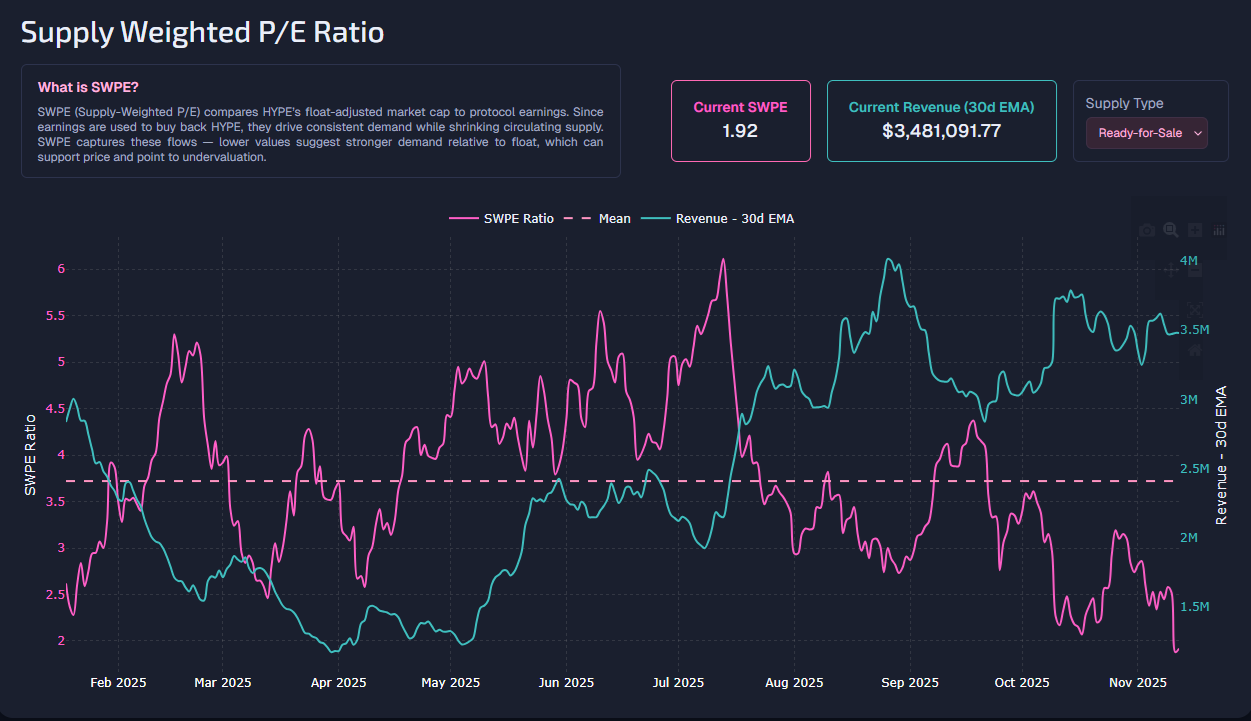The HYPE supply weighted P/E ratio moved to a new low, suggesting robust demand for the tokens within the ecosystem. | Source: Skewga.