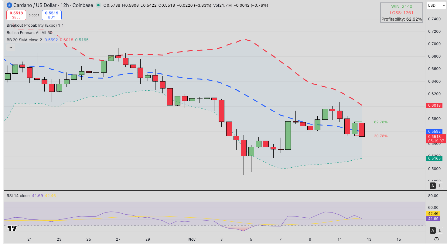 A bullish scenario would require ADA to reclaim $0.56–$0.58 with strong volume confirmation, opening the path toward $0.6018, where the upper Bollinger band currently caps upside attempts.